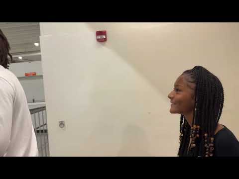 Action Line: Carmen and Anjuel are shaking hands in the school building. In the video the two are giving eachother a greeting handshake also known as dapping one another up. The camera moves in to show the two shaking hands.